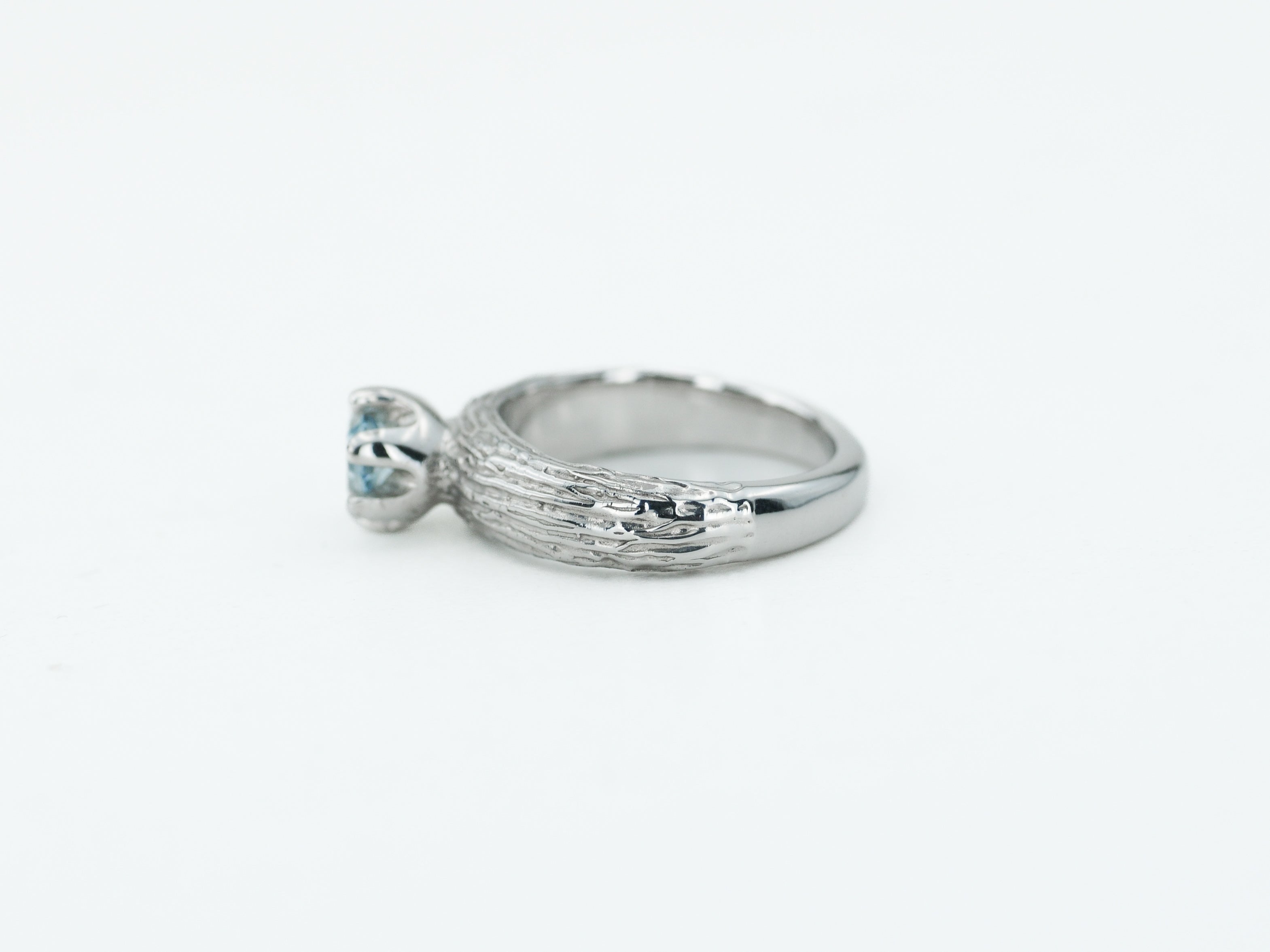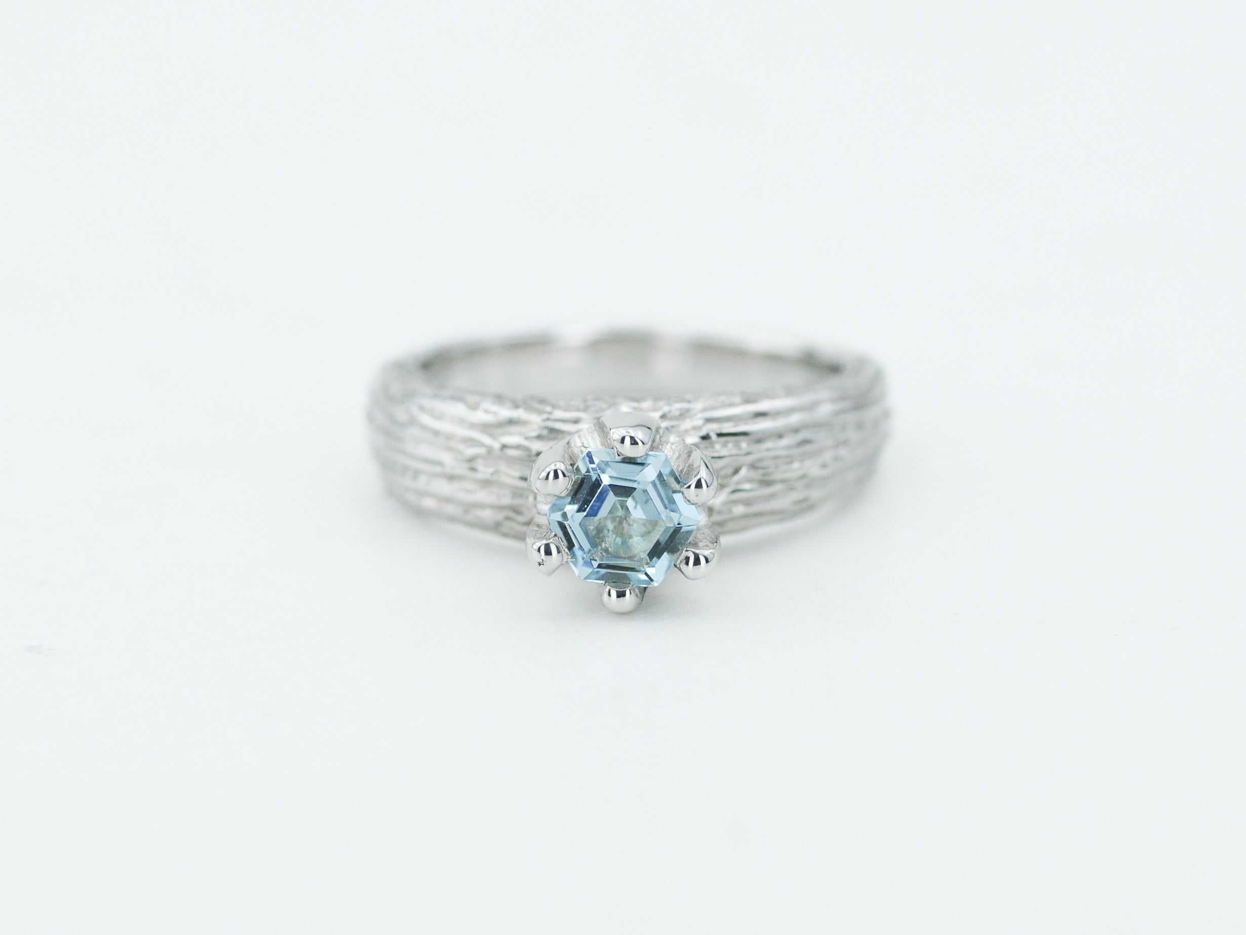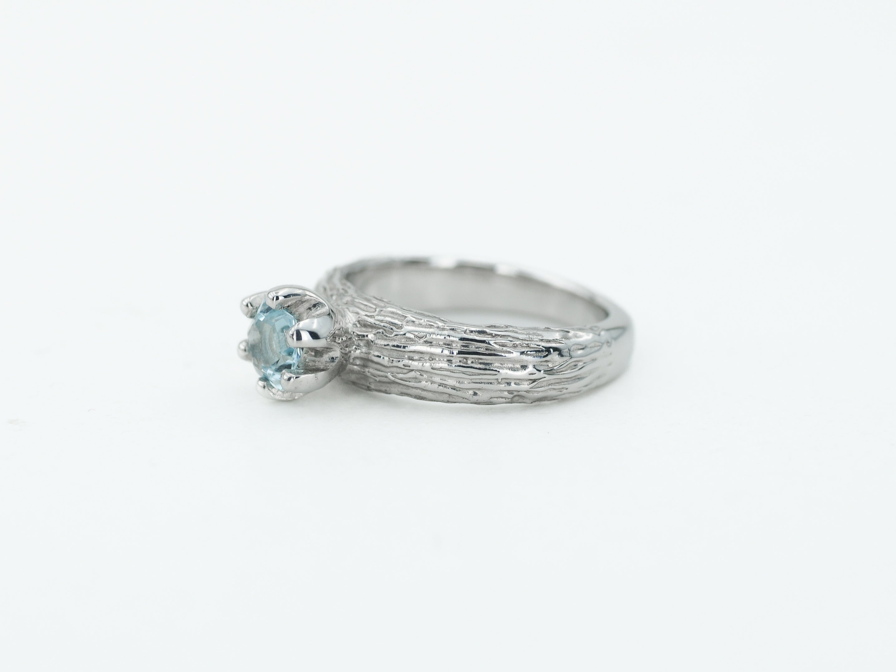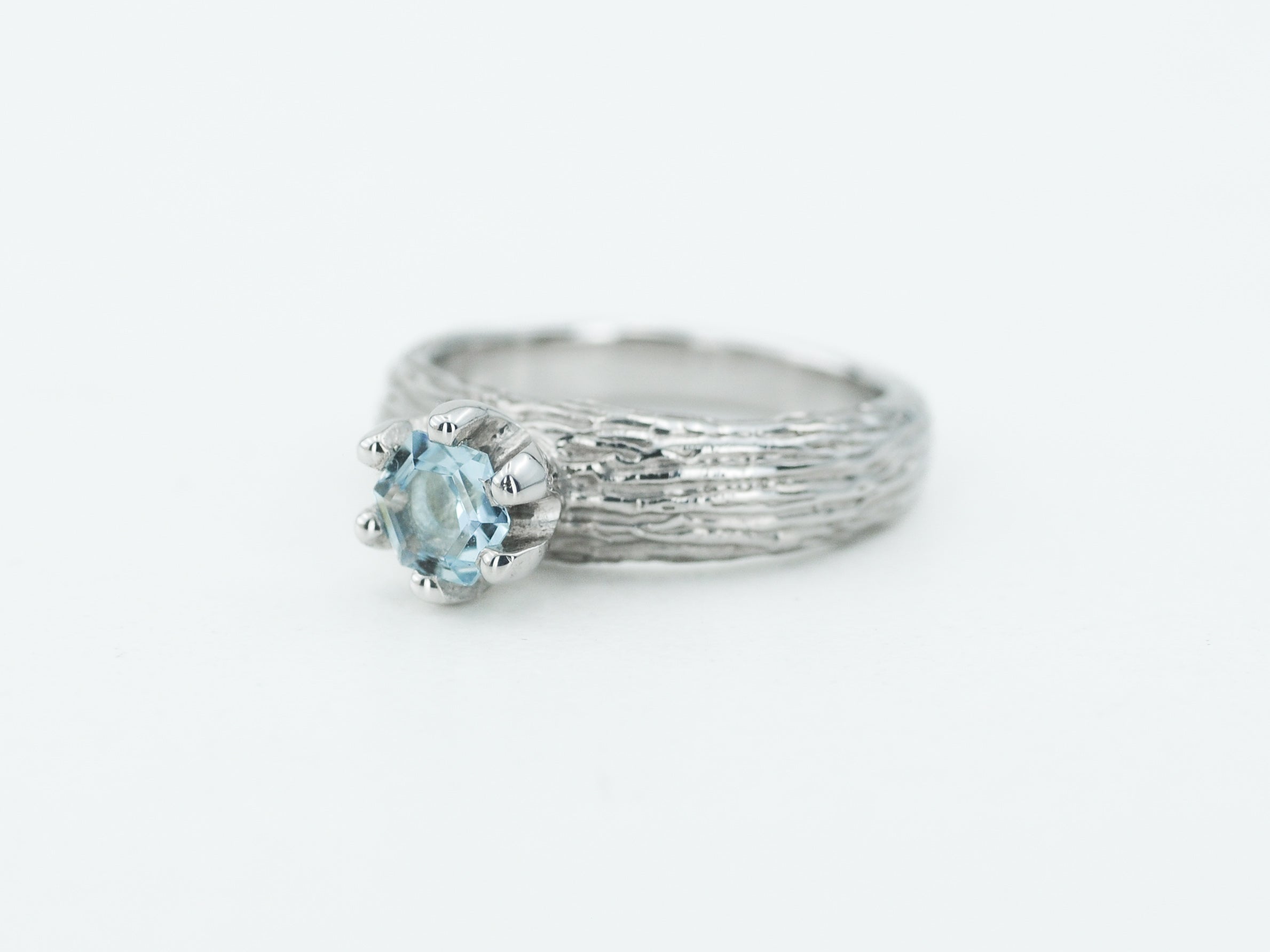 Papuoštas natūraliu akvamarino akmeniu, jis spindi šviesoje vis kitaip – priklausomai nuo kampo ir apšvietimo. Kiekvienas žiedas yra vienintelis toks – rankų darbo netobulumas paverčia jį išskirtiniu ir nepakartojamu.