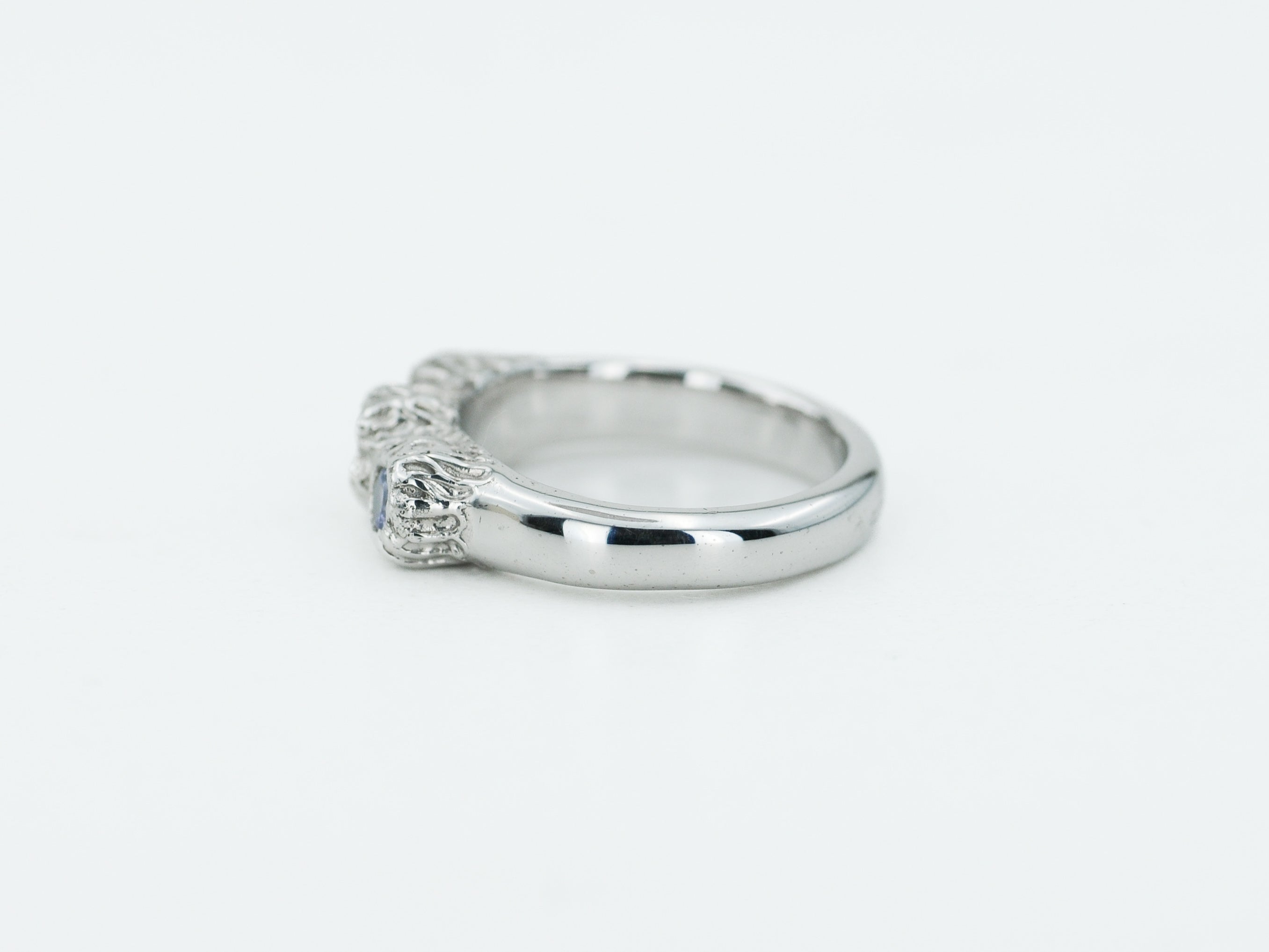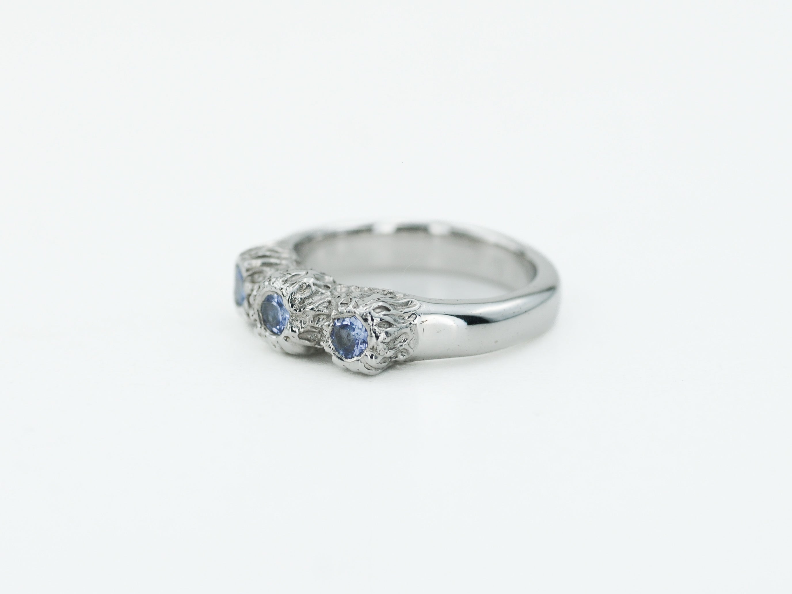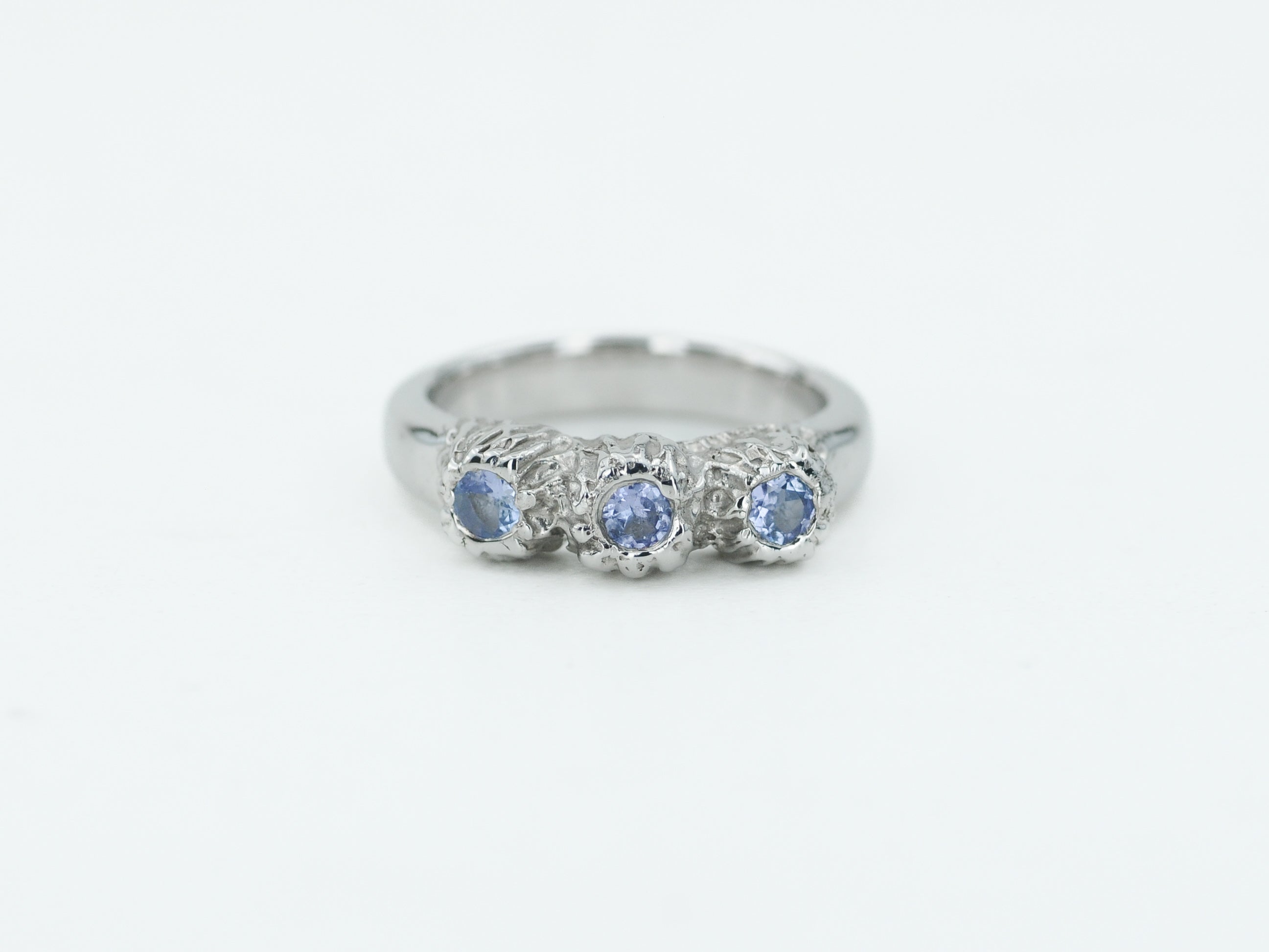 Papuoštas natūraliais tanzanito akmenimis, jie spindi šviesoje vis kitaip – priklausomai nuo kampo ir apšvietimo. Kiekvienas žiedas yra vienintelis toks – rankų darbo netobulumas paverčia jį išskirtiniu ir nepakartojamu.